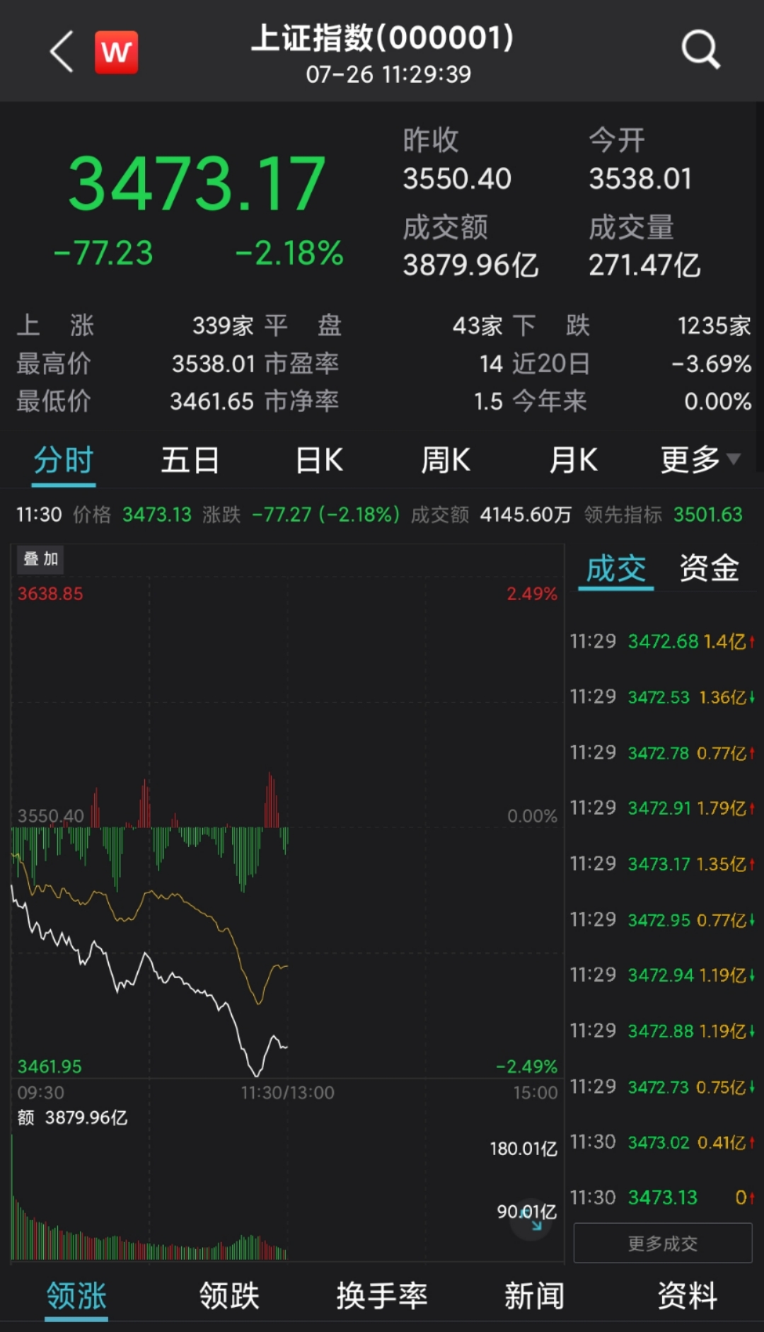 截至午间收盘,沪指跌2.18%,报3473.13点;深成指跌2.50%,报14653.32点;创业板指跌2.82%,报3372.04点。