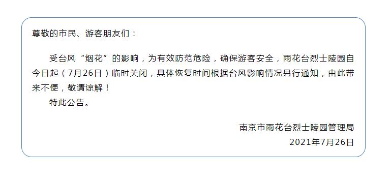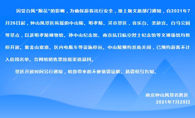 截至目前,雨花台烈士陵园、玄武湖景区、南京钟山风景名胜区和总统府等景点景区已发布公告临时关停。