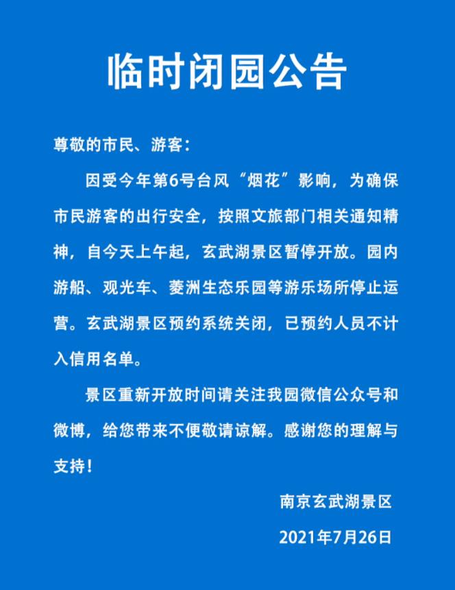 据微信号“南京发布”26日消息,7月25日下午,南京市文化和旅游局迅速向行业内所有单位转发了省厅紧急通知,要求各级文旅部门、各文旅行业单位思想上要高度重视,行动上要果敢决断。要根据气象天气变化,闻“汛”而动、全面备战,所有景区、户外活动全部临时关停,时刻关注风情、雨情、水情变化,尽早部署各项防范措施。