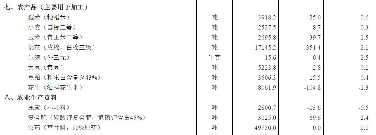 其中,农产品(000061,股吧)方面,稻米价格为3918.2元/吨,环比微降0.6%;小麦价格为3918.2元/吨,环比微降0.3%;玉米价格为2695.8元/吨,环比下降1.5%;生猪(外三元)价格为15.6元/千克,环比下降2.5%