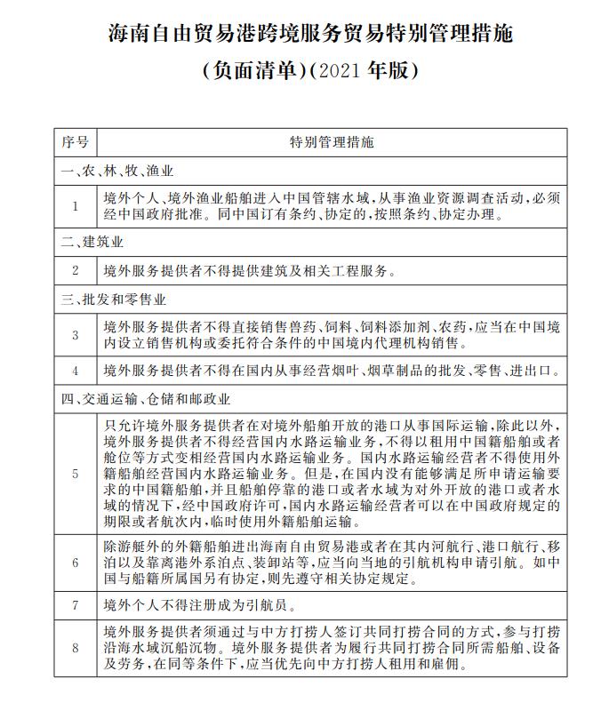 7月26日,商务部发布《海南自由贸易港跨境服务贸易特别管理措施(负面清单)》(下简称负面清单),其中列出针对境外服务提供者的11个门类70项特别管理措施,自2021年8月26日起施行。
