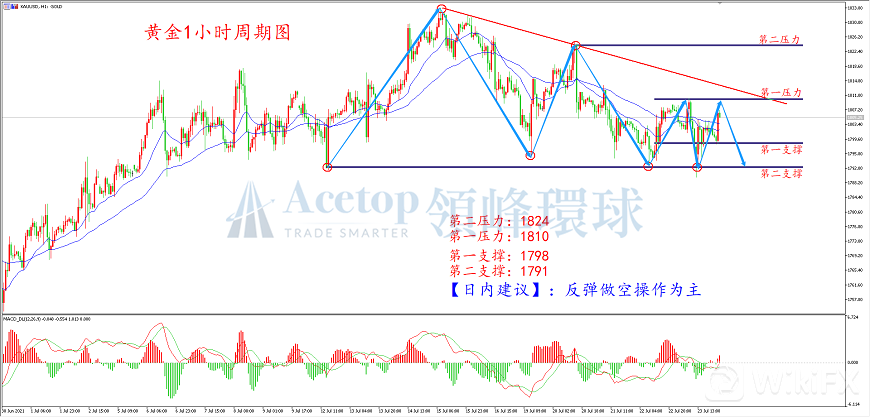 从上图黄金1H周期走势上看, 黄金自1834附近下跌,高点在逐渐降低,低点也在降低,整体走势偏弱,形成三角调整形态,属于横盘调整走势,下方的支撑作用越来越弱,价格反弹幅度越来越低,后市大概率延续下跌,操作上可重点关注空单机会。黄金在此前下跌走势中曾两次在1810.0附近受阻,表明此位置压力较大,后市反弹至此,仍有受阻下跌的可能。结合MACD指标来看,DIFF线与DEA线金叉向上,短线仍有上行可能,空单可等待1810.0附近尝试布局。