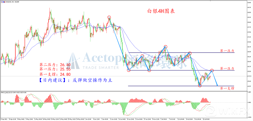 从上图白银1H周期走势来看,白银自26.76附近下跌,高点在逐渐降低,低点也在降低,整体走势偏弱,目前进行反弹调整,对前期的突破位进行回踩,回踩后大概率延续下跌,操作上可重点关注空单机会。目前对应的压力位是25.55附近,结合MACD指标来看,DIFF线与DEA线处于零轴之下,并且呈交叉状态,表现出空头走势,空单可等待其上涨至25.55附近尝试布局。