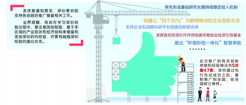 杨海波表示,从历史看,深圳有1000多项创新位列全国第一,深圳从一个只有30万人的农业县一跃成为具有国际影响力的创新城市(300778,股吧),本身“深圳出品”就代表“精品”。从现实看,深圳的这些举措与经验是经过实践证明的可行性强的做法,其他地方基本上复制就可以用了,这降低了其他地区的学习成本。任何改革都是有成本的,深圳承担了改革的成本与风险,要提倡这种“拿来主义”。