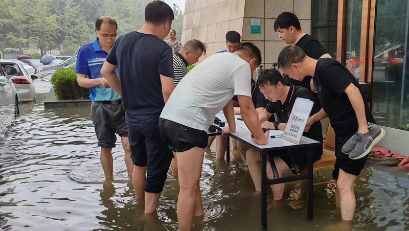 7月21日晚,中国人保科技理赔团队共13人连夜赶往安阳,但因突降暴雨全城被淹,于是科技团队决定在安阳就地开展支援,先行为附近停泡车辆开展科技理赔甄别检测和技术断电服务,避免车主损失进一步扩大。