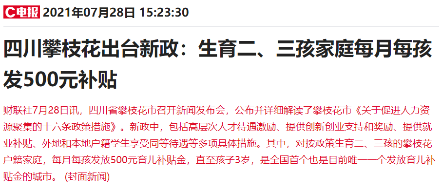 在新闻发布会上,相关负责人公布并详细解读了攀枝花市《关于促进人力资源聚集的十六条政策措施》。其中对按政策生育二、三孩的攀枝花户籍家庭,每月每孩发放500元育儿补贴金,直至孩子3岁,是全国首个也是目前唯一一个发放育儿补贴金的城市。目前其余地区是否会出台类似的政策尚未可知,但7月20日《中共中央国务院关于优化生育政策促进人口长期均衡发展的决定》公布,实施一对夫妻可以生育三个子女政策后,相关配套政策已开始迅速推进。