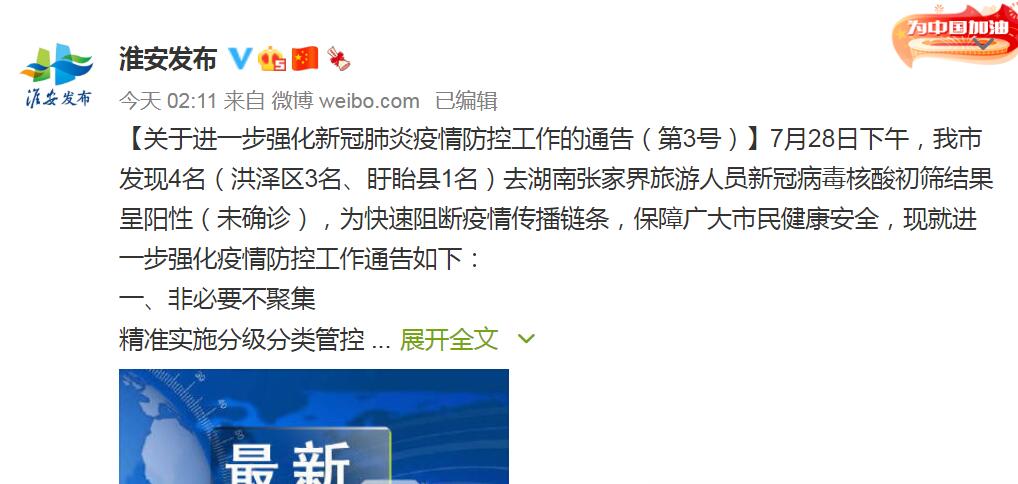 据“淮安发布”微博消息,淮安市新冠肺炎疫情联防联控工作指挥部办公室发布通告称,7月28日下午,淮安市发现4名(洪泽区3名、盱眙县1名)去湖南张家界(000430,股吧)旅游人员新冠病毒核酸初筛结果呈阳性(未确诊),为快速阻断疫情传播链条,保障广大市民健康安全,现就进一步强化疫情防控工作通告如下: