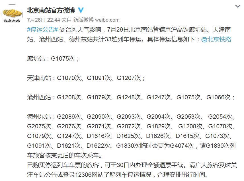 28日晚,北京南站发布公告称,受台风天气影响,7月29日北京南站管辖京沪高铁廊坊站、天津南站、沧州西站、德州东站共计33趟列车停运。