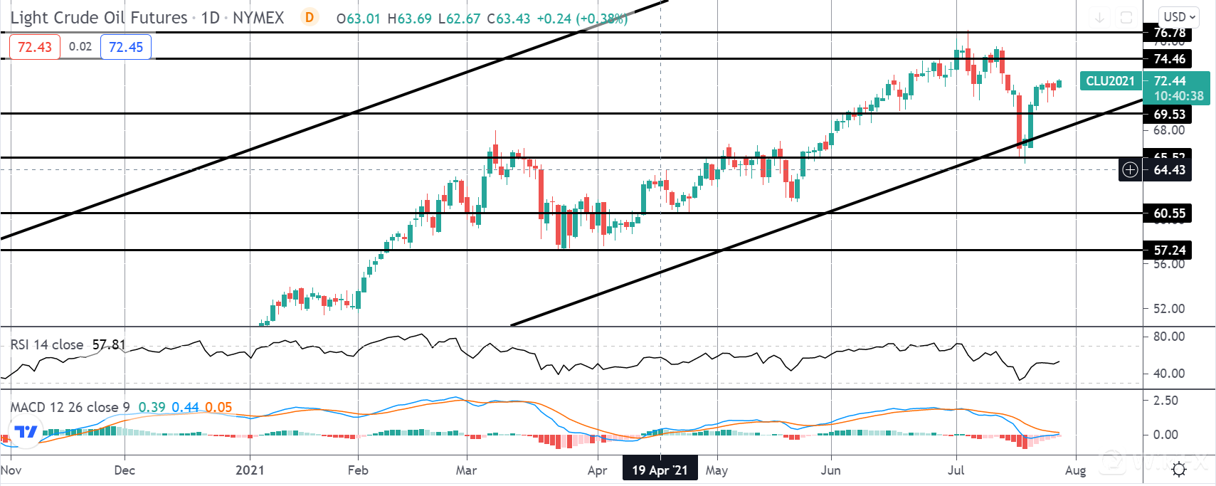 随着价格回到 69.53 的水平上方,短期内焦点仍然是进一步上行,74.46 和 76.78 是主要的上行目标。然而,鉴于近期高点的抛售,这里有必要保持谨慎,因为市场仍有跌至较低高点的风险,这表明有继续走低的空间。任何跌破 69.53 水平的突破都将否定看涨观点。
