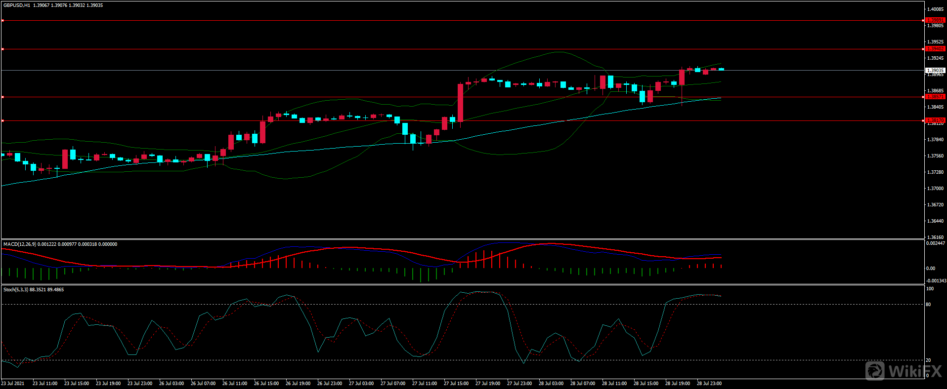 欧元在技术性调整过后再次展开反弹,与预期基本一致,日线收得上下影线阳线,低点继续抬高,多头动能增强,从1H来看,布林中轨拐头向上,MACD零轴上方金叉运行,短线震荡偏多。