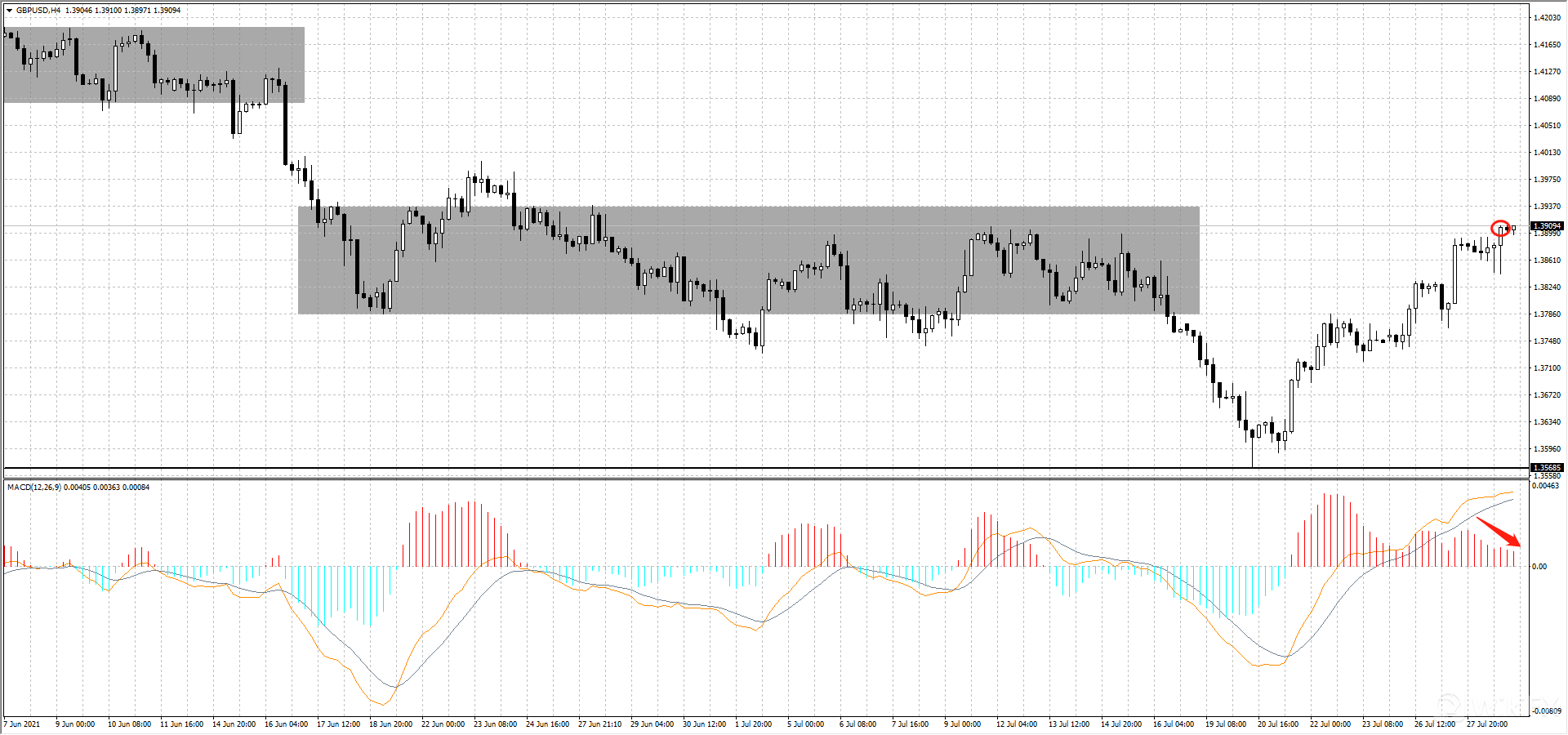 英镑4小时图上看,昨日最高触及1.3910(如图红圈处)MACD红柱逐渐缩短,上行力度减弱,大概率会有技术性的回调,多单可以盈利出场。
