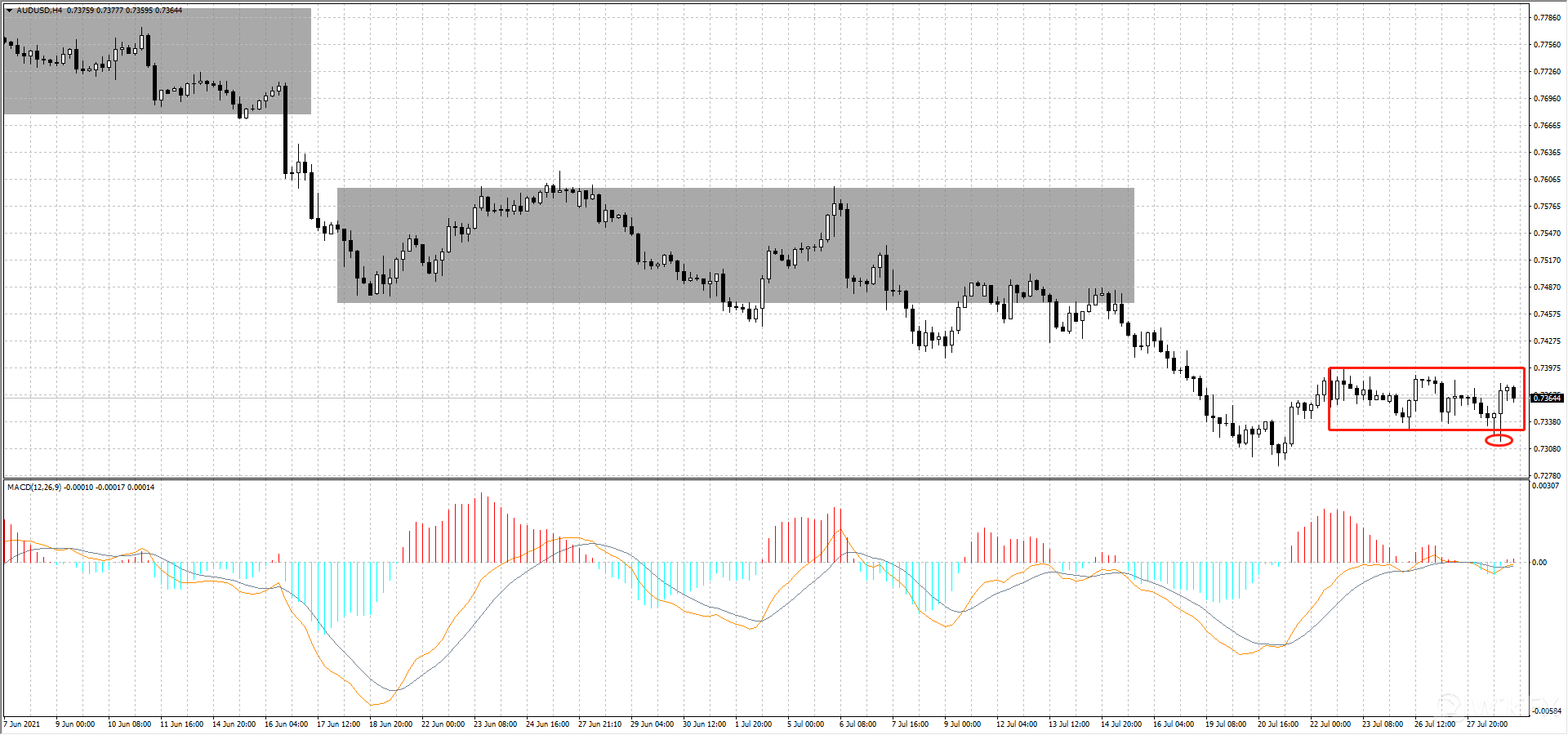 澳元4小时图上看,目前仍在0.7396-0.7329(如图红框处)之间震荡, 昨日最低触及0.7316(如图红圈处)触及震荡中枢下沿后迅速回升,MACD双线在零轴附近形成开口向上的金叉,目前多单可以持续持有并设置止损0.7300。