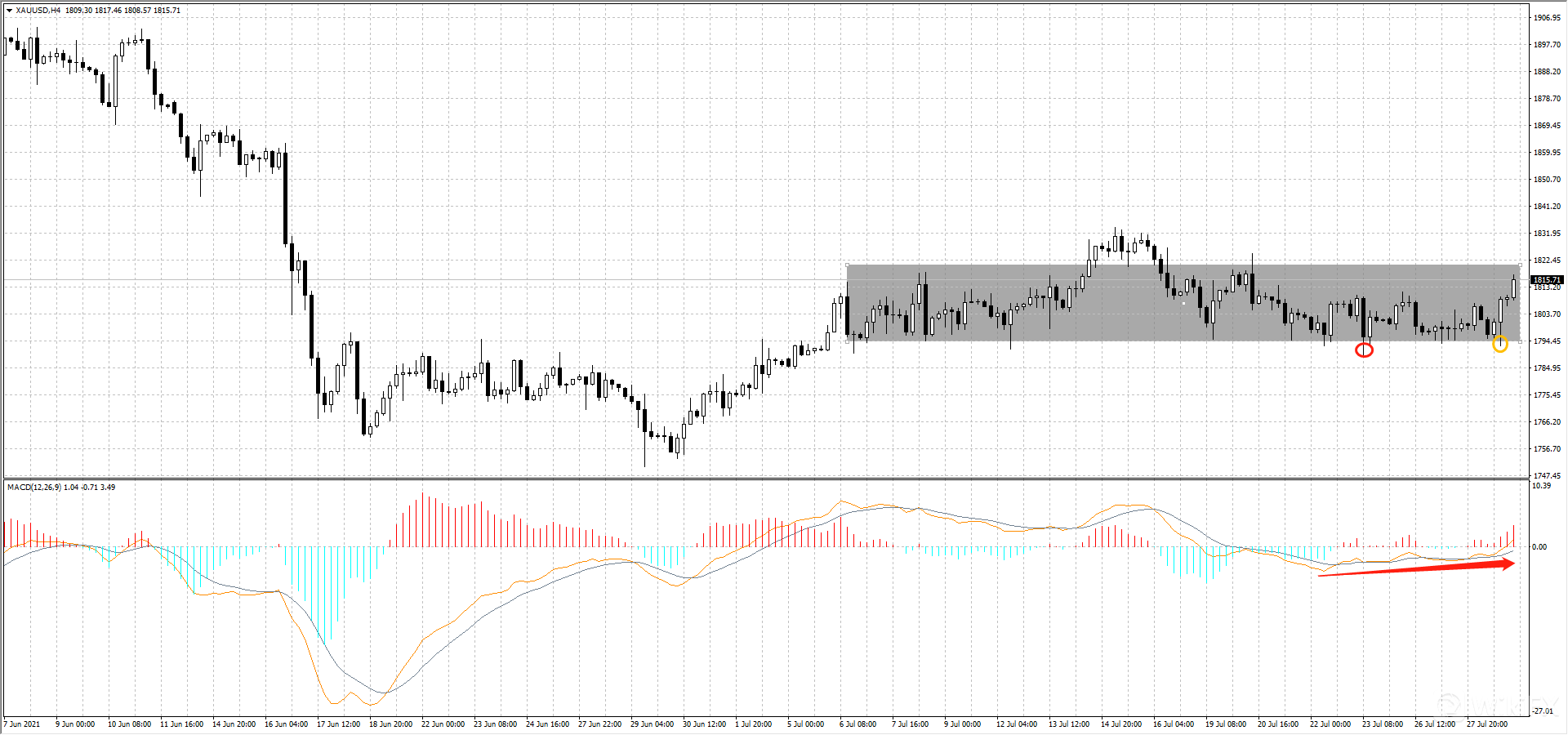 黄金4小时图上看, 目前仍然属于在1818-1790区间震荡,昨日最低触及1792.58(如图黄圈处)为能有效突破前一低点1789.59(如图红圈处)并且MACD双线在零轴之下形成金叉,多单可以持续持有并设置止损1789。