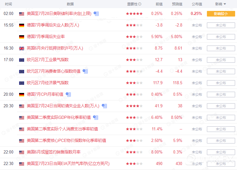 基本面:欧元区今日公布德国7月季调后失业人数,前值-3.8,预期值-2.8;德国7月季调后失业率,前值5.9,预期值5.8;德国7月CPI月率初值,前值0.4,预期值0.5,美联储鸽派言论,需要关注后续影响。