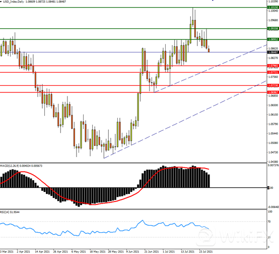 也就是说,7月的利率决议并未有释出新的信息何时将缩减买债规模,缺乏具体时间表和方向下重覆早前鸽派立场,市场明显对此决议感到失望,美元在决议过后有所下滑。美元指数连续第3天下挫,十年期美债收益率也进一步向下。