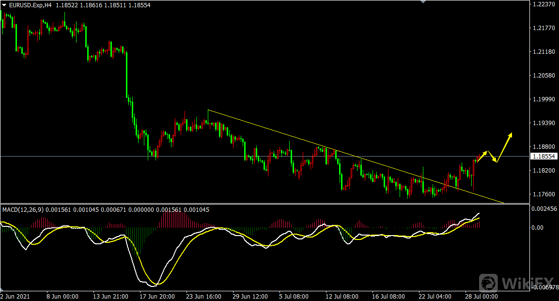 从欧元兑美元4小时图来看,欧元兑美元上破后有回踩,凌晨的美元数据再次加剧了向上突破,最近几个交易日将继续走一段小级别的多头趋势行情。