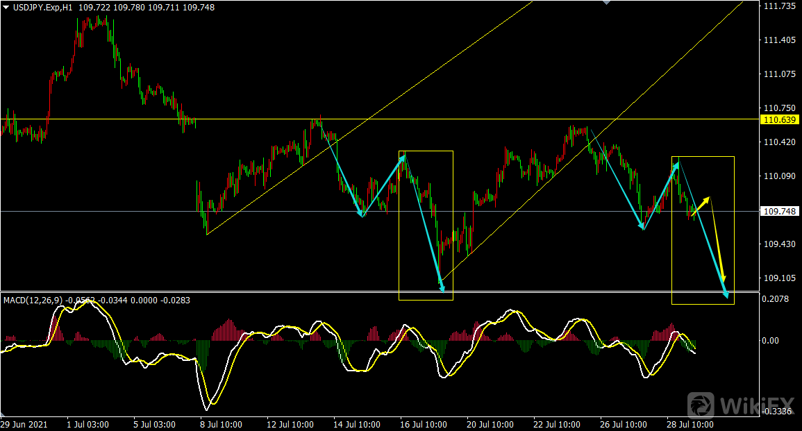 从美元兑日元1小时走势来看,美元兑日元再次冲高走出了相对应之前支撑线破位的次高点,参考前一次下跌,多头已验证压力,下方还有很大空间。