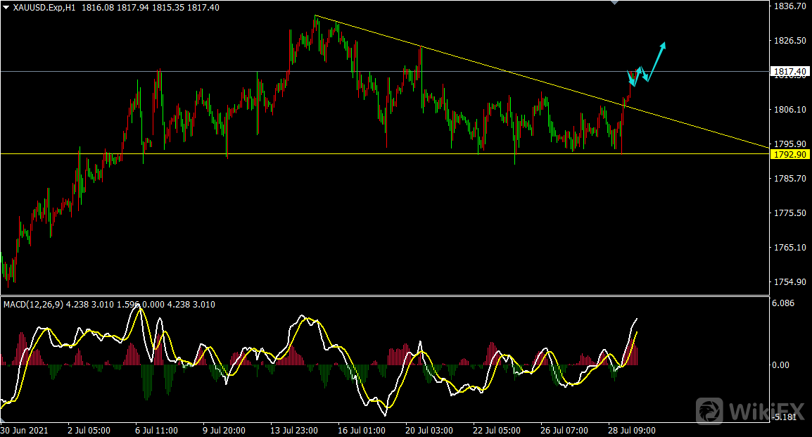 从国际黄金1小时图来看,黄金选择了向上突破,有些类似于欧元兑美元四小时级别的形态,未来一段时间最近高点将不断的被上破,形成一段多头趋势行情。