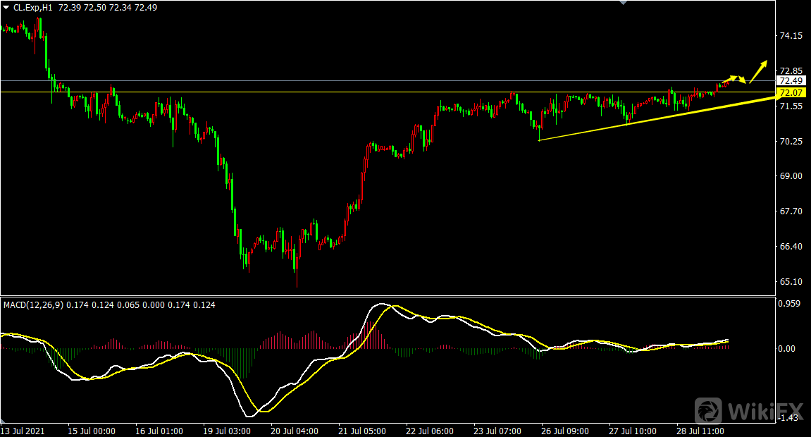从WTI原油1小时图来看,原油已经上破水平高点压力,前三个交易日的回落低点不断抬升,形成向上收敛的形态,也代表了调整,接下来是新的多头拉升。