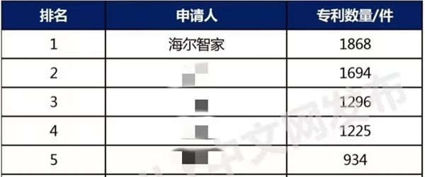 榜单显示,拥有千件级别专利申请量的仅有4家,海尔智家以1868件位居第一,实现5连冠。前4次排行专利数分别达到了1243件、768件、1163件和2034件。