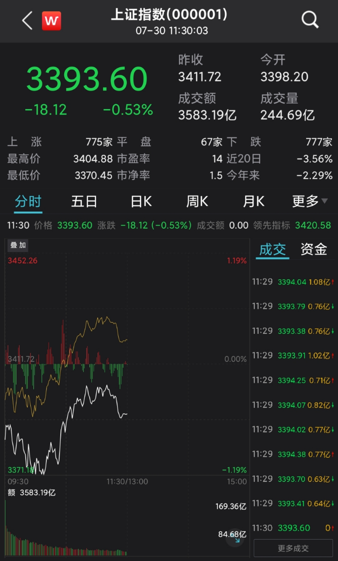 截至午间收盘,沪指跌0.53%,报3393.60点;深成指跌0.48%,报14445.14点;创业板指跌0.32%,报3448.62点。