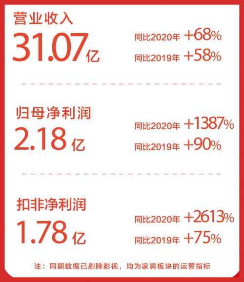 7月29日晚,喜临门发布《2021年半年度报告》。报告显示,2021年上半年,喜临门实现营业收入31.07亿元,归母净利润2.18亿元,扣非净利润1.78亿,剔除去年同期影视业务因素后,营业收入同比增长68%,归母净利润同比增长1387%,扣非净利润同比增长2613%。值得注意的是,自主品牌零售业务营收19.92亿元,同比上年增长107%。