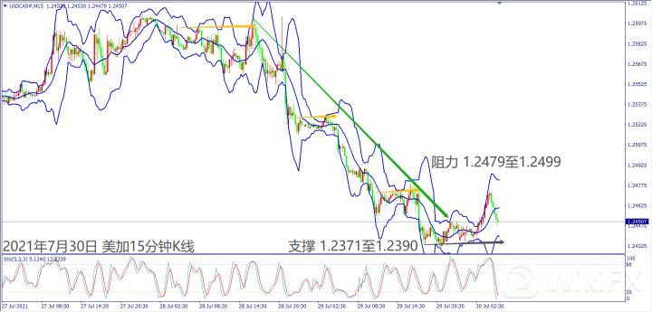 日级别线图,跌破短线盘整支撑1.2500关口,5日均线反压盖头,可能回测1.2400;15分钟K线,短线形成盘跌走势,一旦跌破1.2430,大有可能下探支撑。