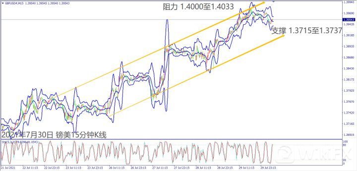 日级别线图,出现连四阳涨势,一旦突破60日均线,可能挑战1.4080;15分钟K线,短线出现上升矩形,1.4000关口若突破,有望延续上行。