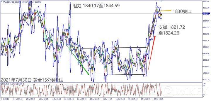 日级别线图,长阳烛收复两周跌势,一旦突破60日均线,有机会挑战1850美元;15分钟K线,箱型反转涨势延续,1830美元附近若进行盘整,大有可能挑战上方阻力。