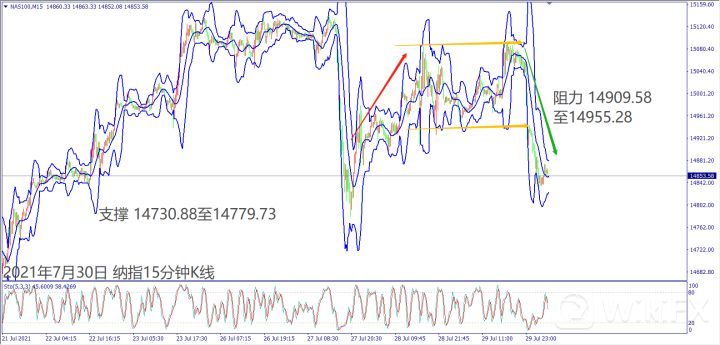 日级别线图,三天冲不过5日均线,该均线下弯形成反压,可能回测30日均线;15分钟K线,短线出现箱型反转,盘整底部冲不过,大有可能下探支撑。