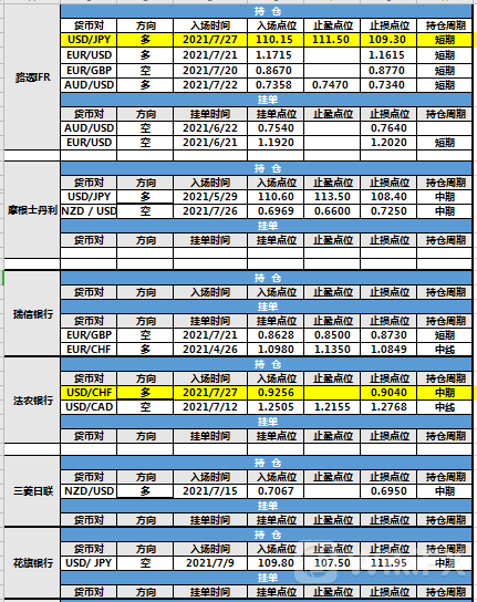 持仓方面,路透IFR、法农银行两投行仓位调整。路透IFR美元兑日元,止盈点位调整至111.50,止损点位调整至109.30,目前处于持仓中。法农银行美元兑瑞郎止损点位调整至0.9040,目前处于持仓中。