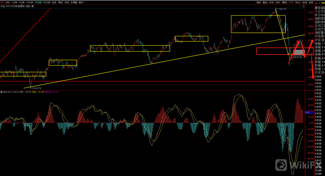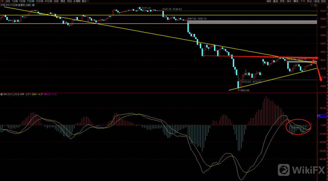 沪深300目前面临着十五分钟的三角收敛末端,如果出现冲高则在回抽到前高附近后才会再回落,而如果直接跌破则大概率会再次试探前期低点支撑。