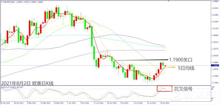 日级别线图,纺锤线阴烛受阻1.1900关口,KD出现死叉一旦跌破5日均线,可能再度转跌。
