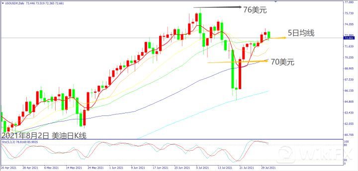 日级别线图,短线70美元支撑拉出连3阳,守住5日均线,有机位挑战7月高点76美元。