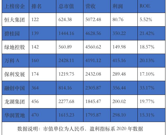 碧桂园、恒大、绿地、保利和万科是世界500强的老选手了,但融创、龙湖和华润是榜单中的新面孔,分别位列第364名、456名以及470名。