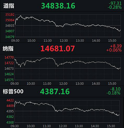 截至收盘,道琼斯工业指数跌97.31点,跌幅0.28%,报34838.16点;纳斯达克指数涨8.39点,涨幅0.06%,报14681.07点;标普500指数跌8.10点,跌幅0.18%,报4387.16点。