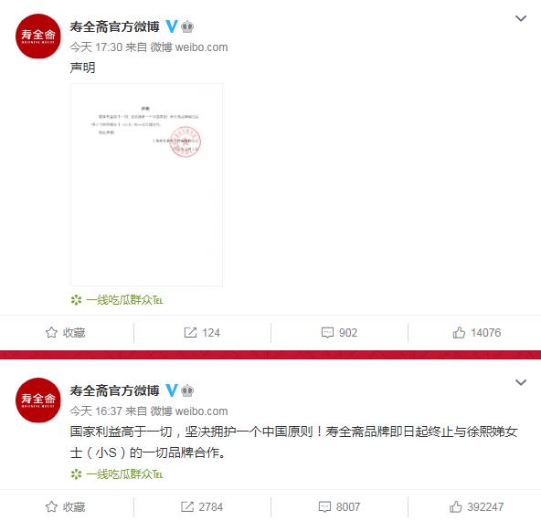 寿全斋表示,国家利益高于一切,坚决拥护一个中国原则!寿全斋品牌即日起终止与徐熙娣女士(小S)的一切品牌合作。