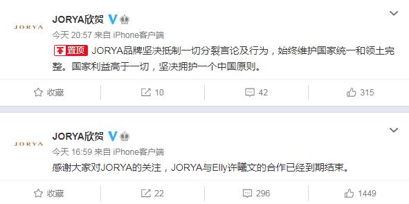 此外,服装品牌JORYA表示,与Elly许曦文的合作已经到期结束。