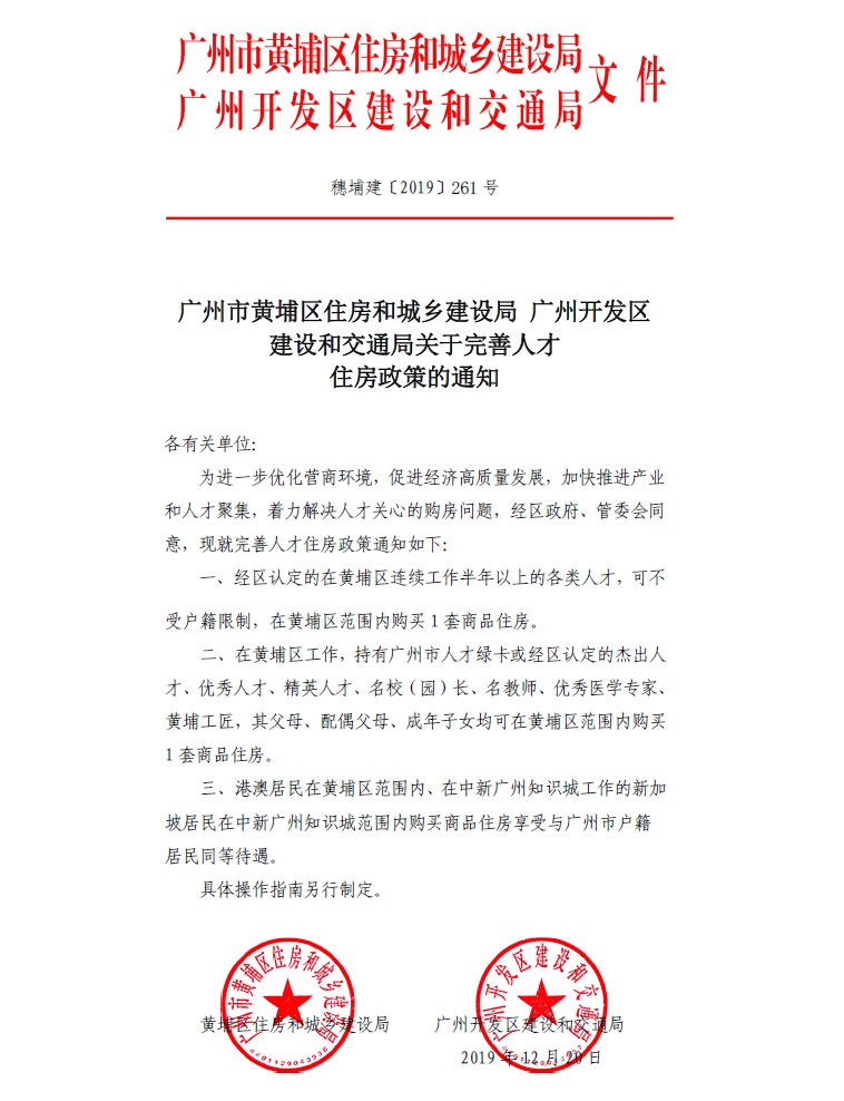 通知称,为促进房地产市场平稳健康发展,决定取消《广州市黄埔区住房和城乡建设局 广州开发区建设和交通局关于完善人才住房政策的通知》(下称《人才住房政策通知》)。