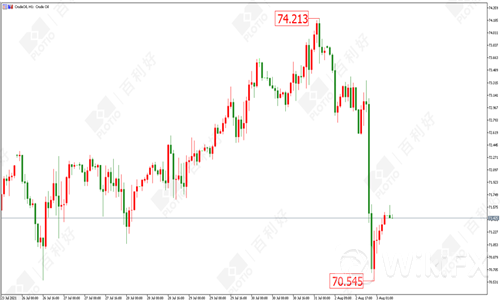 原油方面:昨日(8月2日)晚间原油突然大幅下挫,最低触及70.54美元的位置,一举吃掉多天的涨幅。