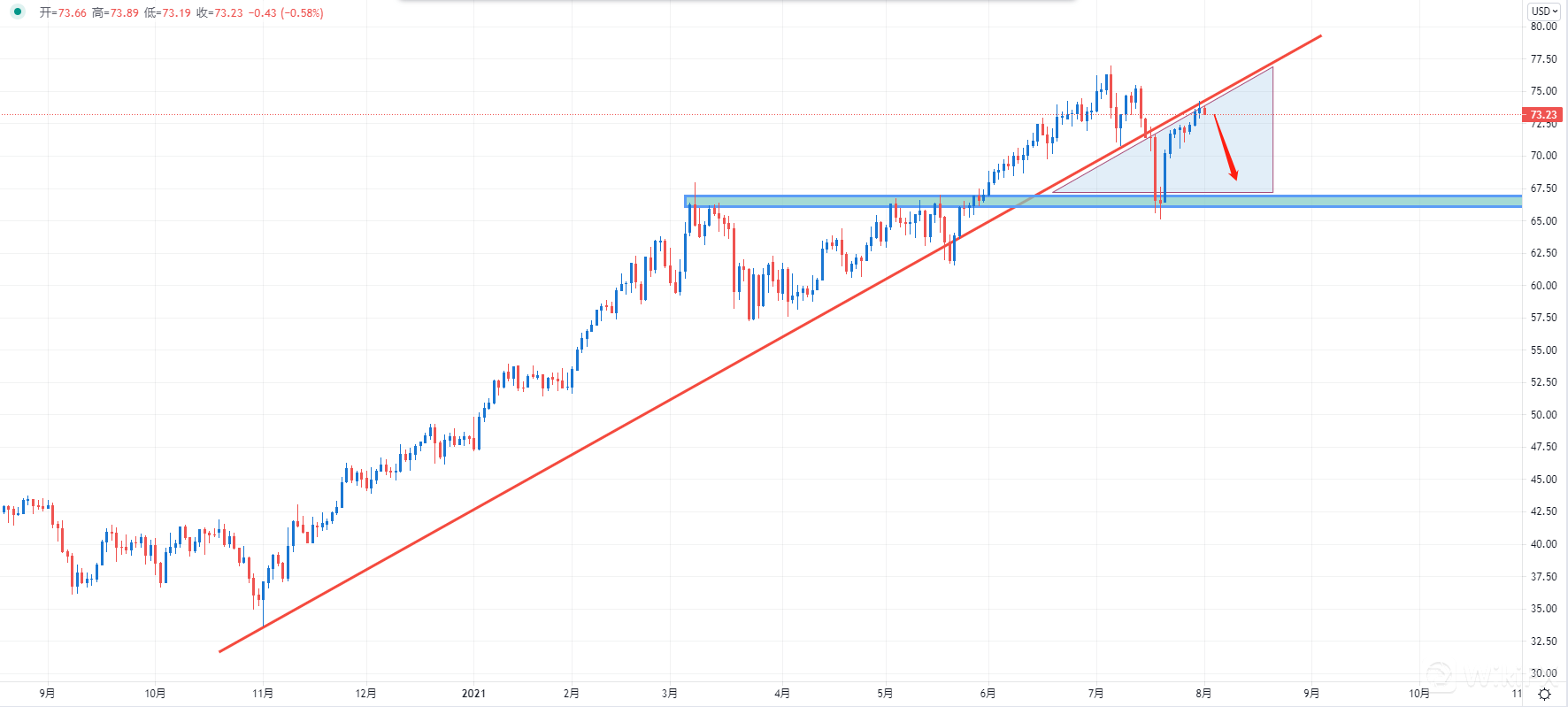 【技术点评】:D1周期,油价跌破上升趋势线,并完成回踩动作。