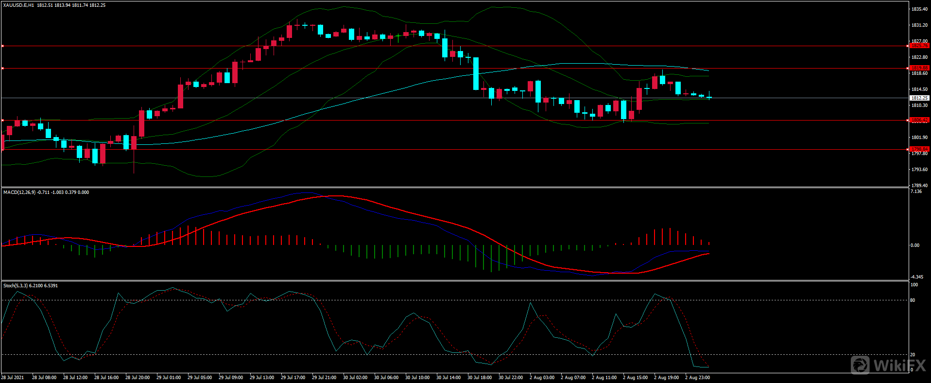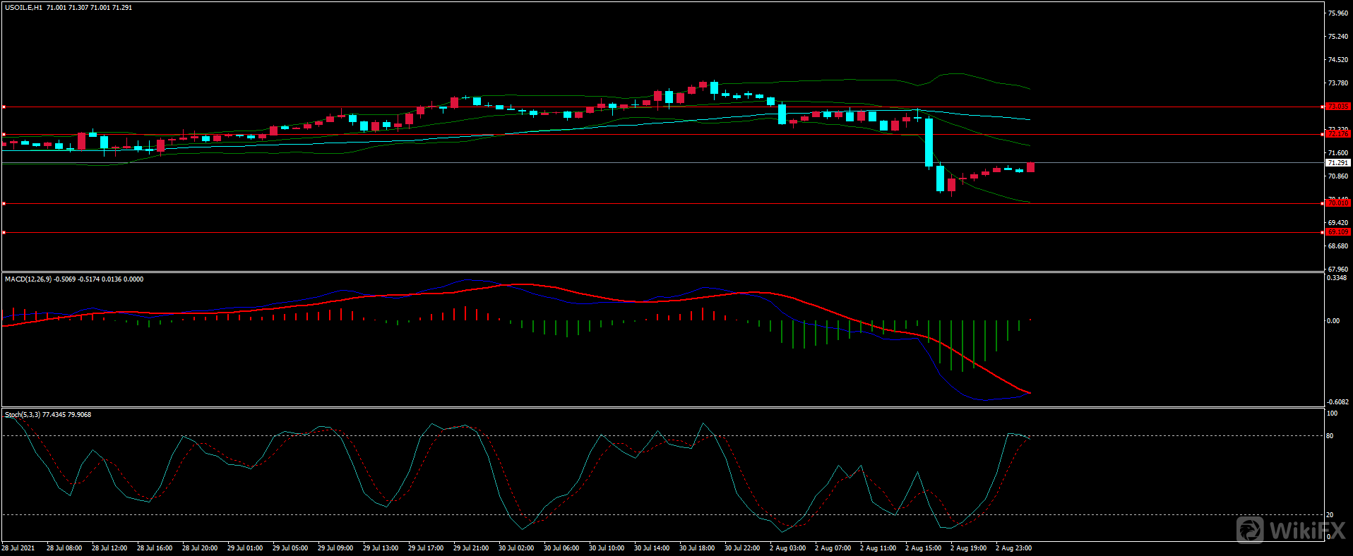 原油在调整过后承压下行,至收盘再次回落至前支撑后收得下影线中阴线,从日线来看,上方阻力保持,同时下方面临多重支撑,日线进退两难,结合1H来看,布林中轨略有拐头,MACD零轴附近死叉运行,短线处于多空交接地带面临方向选择。