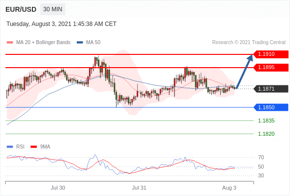 交易策略:在1.1850之上,看涨,目标价位为1.1895,然后为1.1910。
