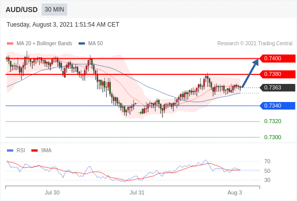 交易策略:在0.7340之上,看涨,目标价位为0.7380,然后为0.7400。