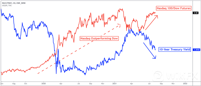 一份大幅疲弱的就业报告有可能引发金融市场的激进避险情绪。在这种情况下,考虑到科技板块的高估值,纳斯达克100指数可能会更加脆弱。与此同时,美国参议员本周可能会通过一项5500亿美元的基础设施法案。这可能会重燃公债收益率(殖利率),促使美联储缩减购债规模的押注提前,让投资者重新青睐道琼指数而非Nasdaq指数。