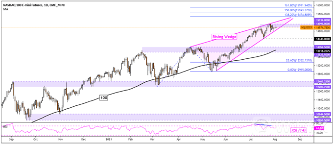 不过,Nasdaq 100指数看跌Rising Wedge,关注支撑位