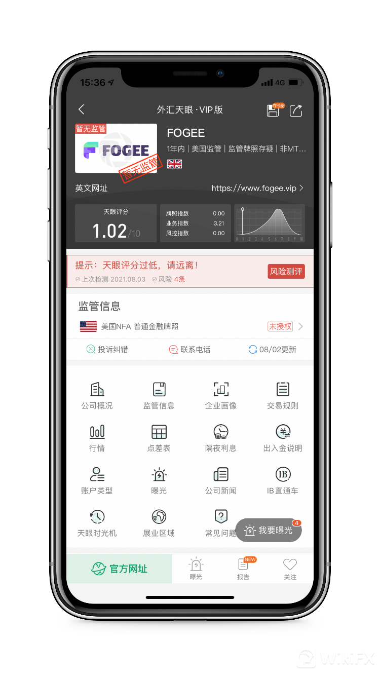 天眼评分1.02分,宣称持有的美国NFA普通金融牌照状态为未授权,当前暂无其他任何实际有效的监管,存在巨大风险。