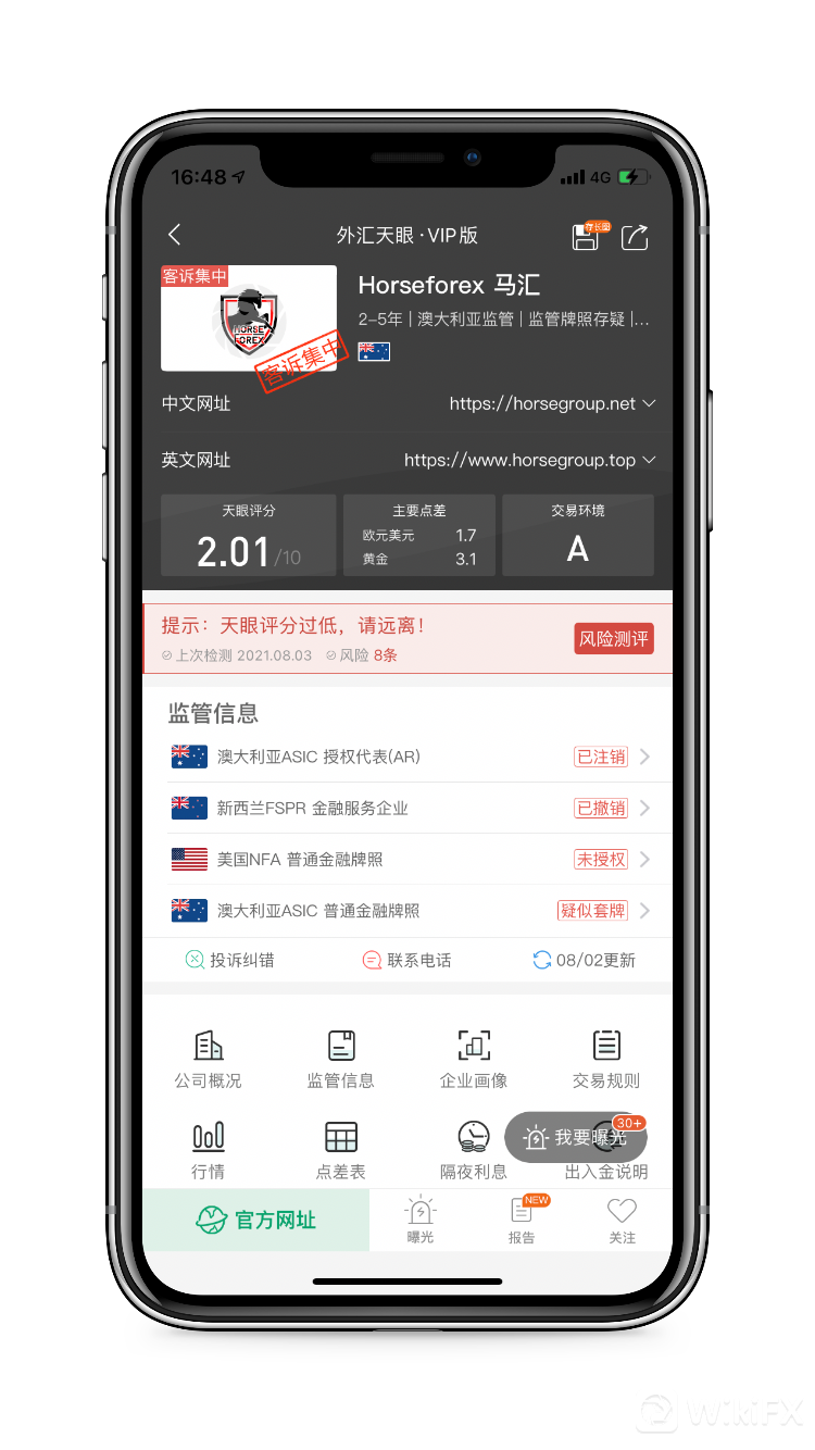 天眼评分2.01分,宣称持有的澳大利亚ASIC授权代表牌照已注销、新西兰FSPR金融服务企业牌照已撤销、美国NFA普通金融牌照未授权、澳大利亚ASIC普通金融牌照疑似套牌,当前没有任何实际有效的监管牌照,近三个月来天眼已收到超100条客诉,该平台已经被外汇天眼列入黑名单,存在巨大风险。