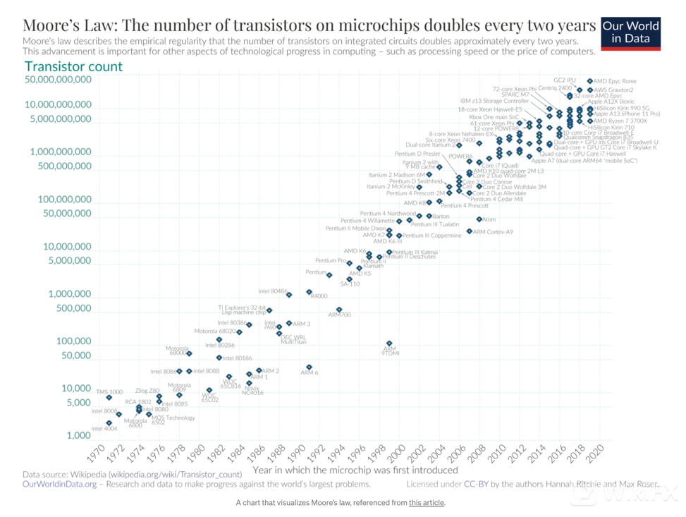 要理解为什么计算能力在过去50年里对算法交易的拖累越来越小,就得看看摩尔定律了。