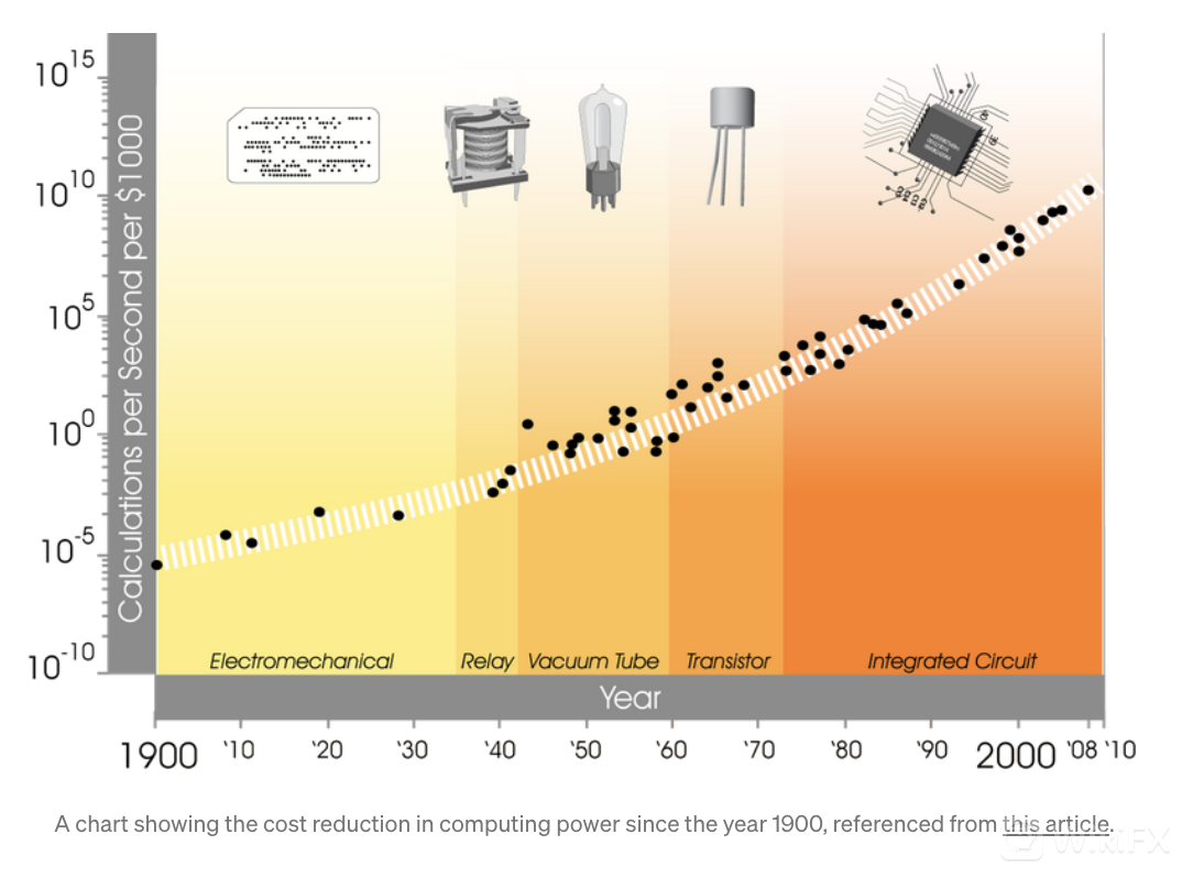 这张图表显示了自 1900 年以来计算能力的成本在下降